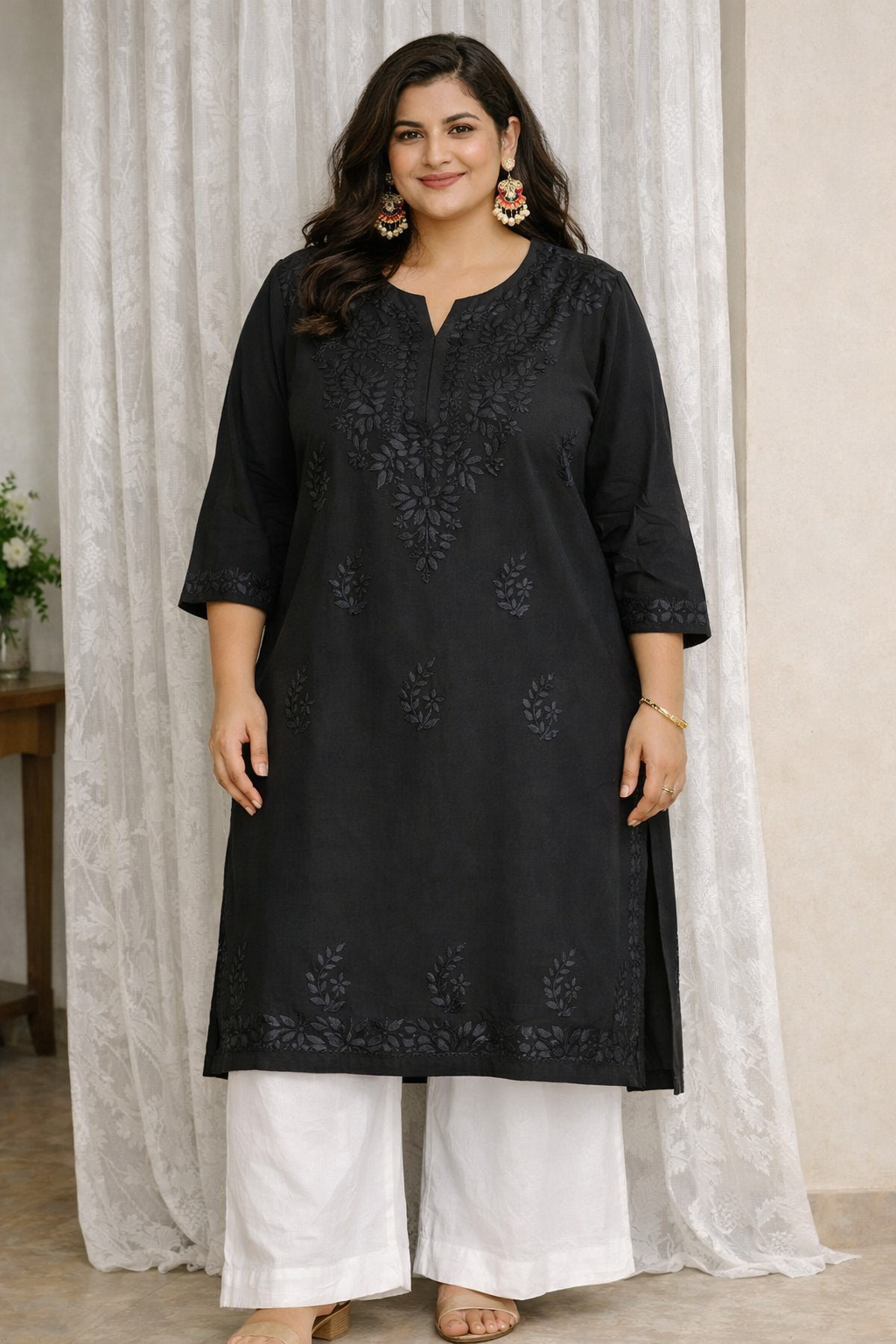 Designed especially for plus-size and curvy silhouettes, this straight-fit long kurti falls gracefully below the knee, creating a tall and flattering appearance. The subtle sheen of the embroidery on black fabric adds a luxurious charm, making it perfect for both day and evening wear.